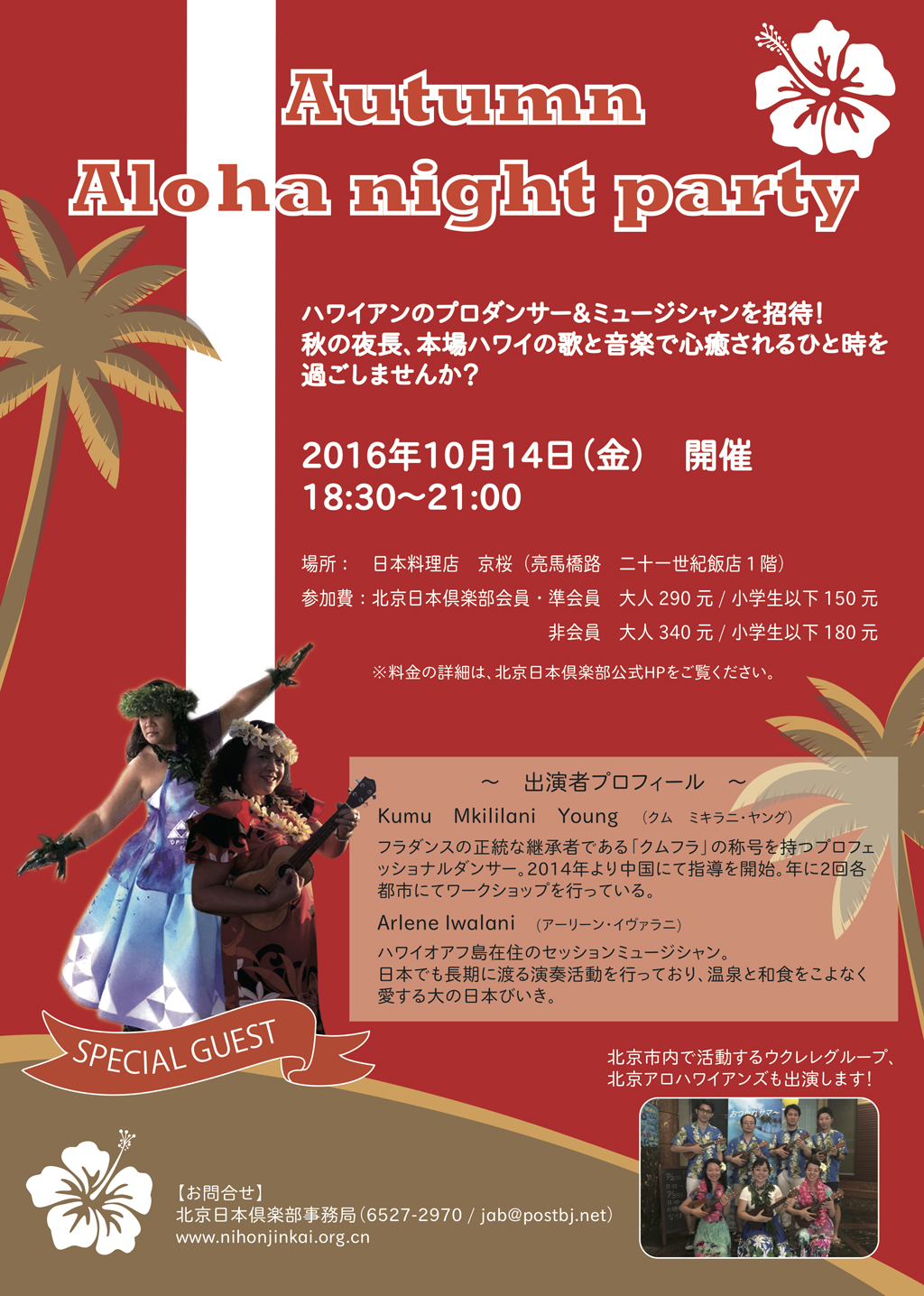 北京日本倶楽部では、アメリカよりフラダンスとウクレレの家元の先生をお招きし、みなさんにハワイの伝統文化を、アットホームな雰囲気で楽しんで頂くディナー付きイベントを行います!