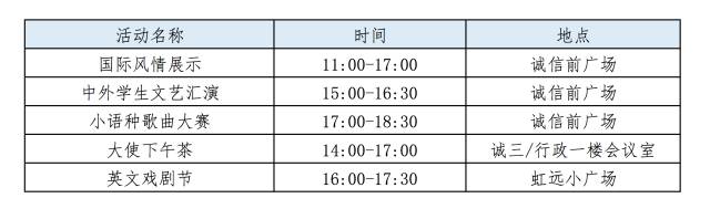 除此之外,中外学生文艺汇演和小语种歌曲大赛也将给你带来不同的惊喜。如果你想跟大使近距离交流,欢迎去大使下午茶坐一坐,一定会有满满的收获。英文戏剧节也将在虹远小广场拉开帷幕,你怎么舍得错过呢?
